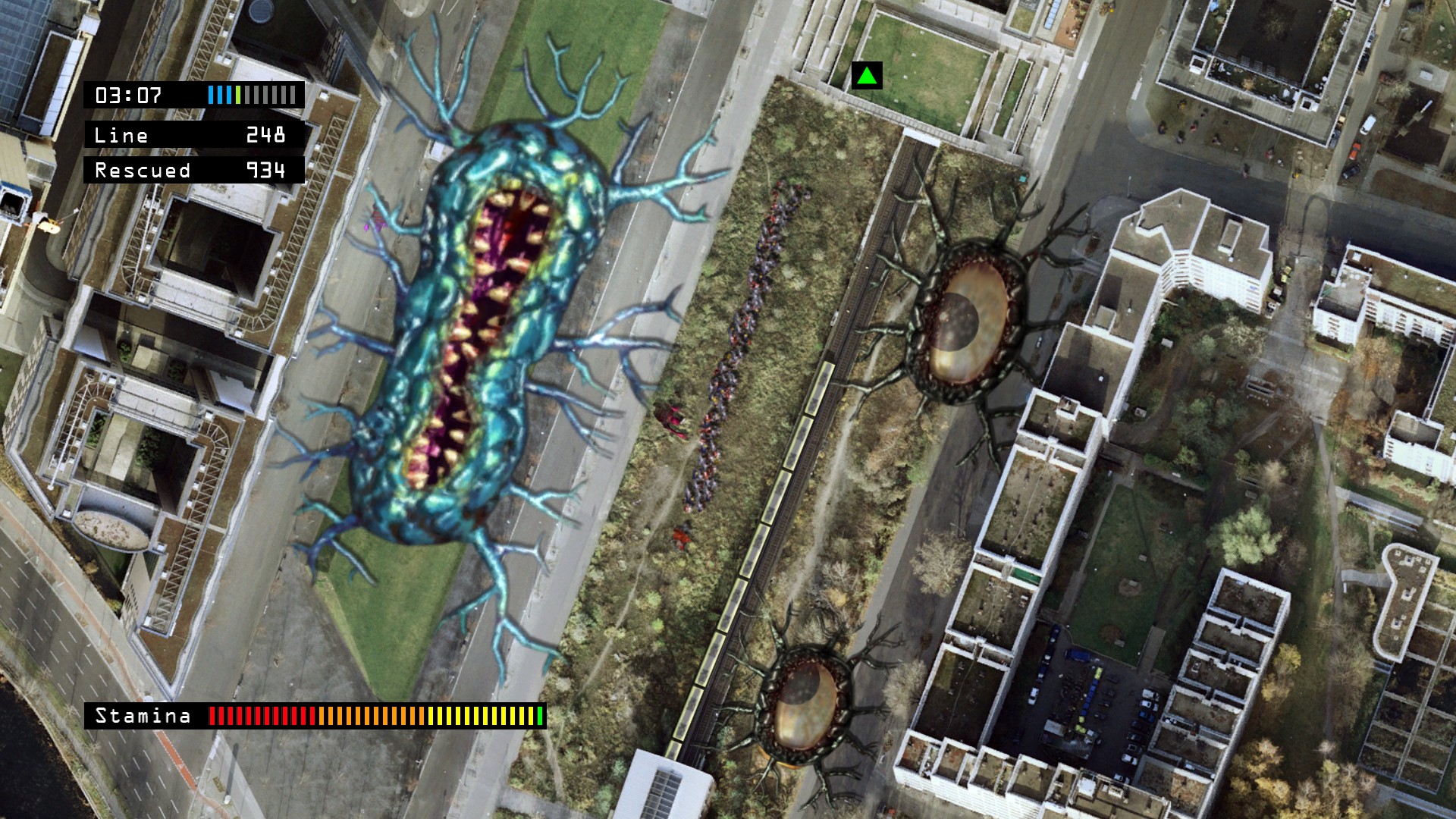 PS3®の描画能力を最大限活用して表現された、超高精細航空写真の実在都市を舞台とし、ゾンビが蔓延する街から、住民達を率いて救い出す“大行列アクションゲーム”。